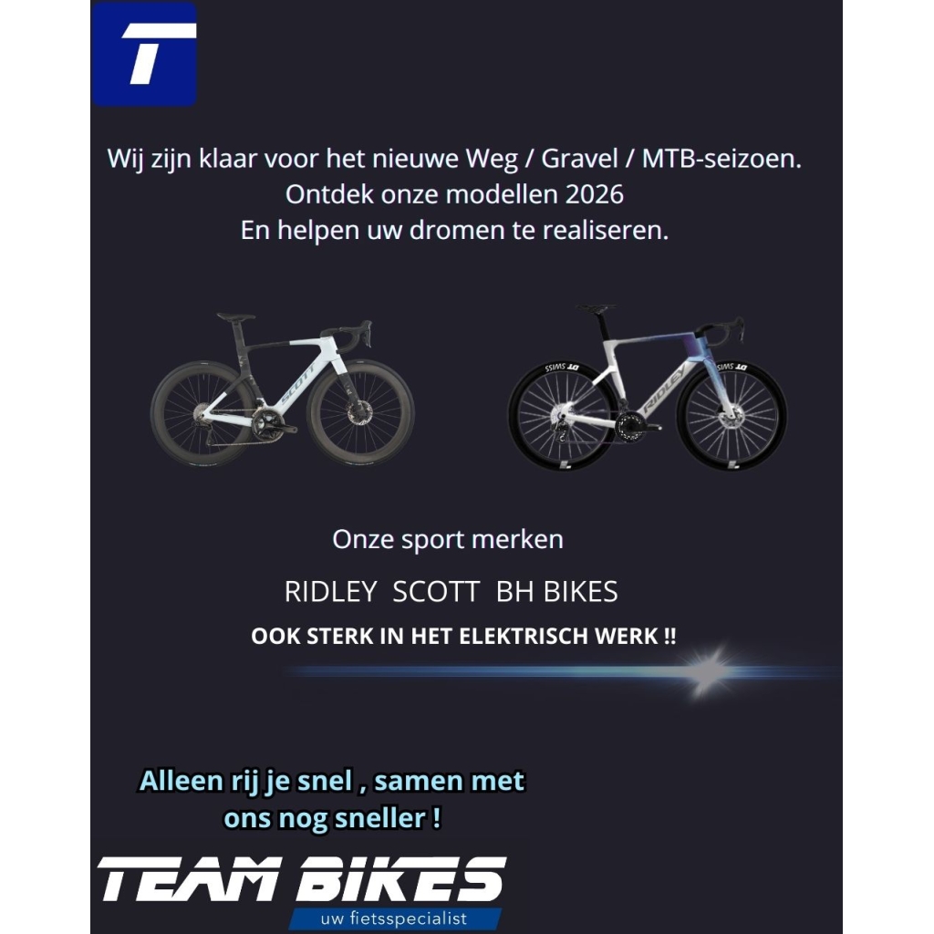 Bij Team Bikes vind je een breed assortiment fietsen voor dames, heren en kinderen. Van elektrische fietsen en stadsfietsen tot sportieve mountainbikes en snelle racefietsen – wij hebben voor ieder wat wils. Of je nu dagelijks naar het werk fietst, recreatief de weg op gaat of sportieve prestaties wilt leveren: bij ons vind je de perfecte fiets voor jouw behoeften en budget. Kom langs in de winkel of bekijk ons actuele aanbod online.